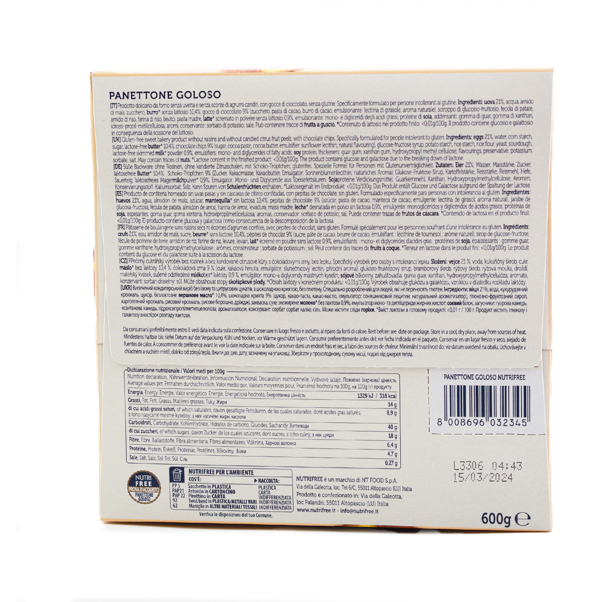 Nutri Free Panettone Goloso Con Gocce di Cioccolato Senza Glutine 600g