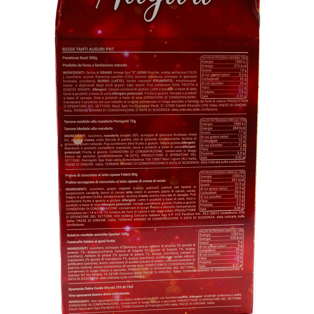 | Denominazione: | Panettone Baluli 500g Torrone Morbido alla Mandorla Pernigotti 75g Praline di Cioccolato al Latte Ripiene Feletti 80g Gelatine Morbide Assortite Sperlari 100g Spumante Dolce Cuvee Oro 0,75l |