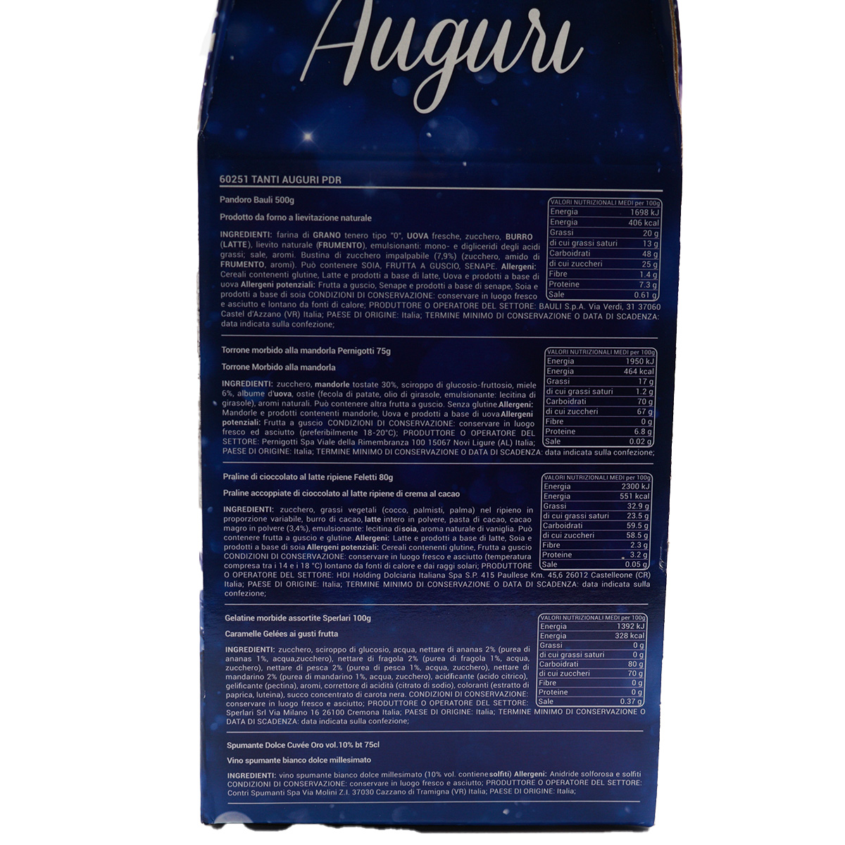 | Denominazione: | Pandoro Baluli 500g Torrone Morbido alla Mandorla Pernigotti 75g Praline di Cioccolato al Latte Ripiene Feletti 80g Gelatine Morbide Assortite Sperlari 100g Spumante Dolce Cuvee Oro 0,75l |