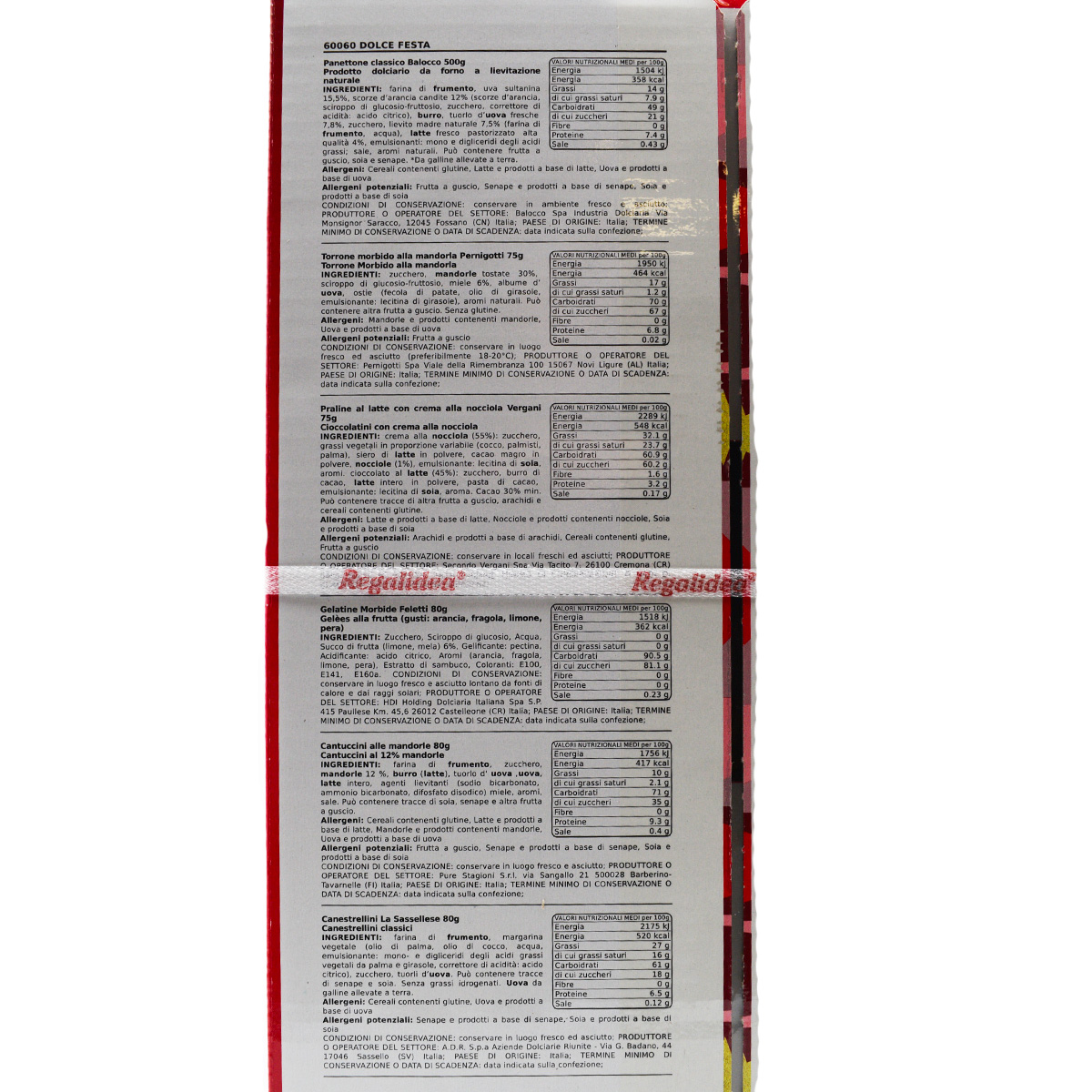| Denominazione: | Vassoio litografato Balocco panettone classico 500g La Sassellese canestrelli specialità di pastafrolla 80g Feletti Le Deliziose gelatine morbide frutta 80g Pernigotti torrone morbido alla mandorla 75g Vergani praline al latte ripiene crema 75g Ghiottini cantuccini alla mandorla 80g |